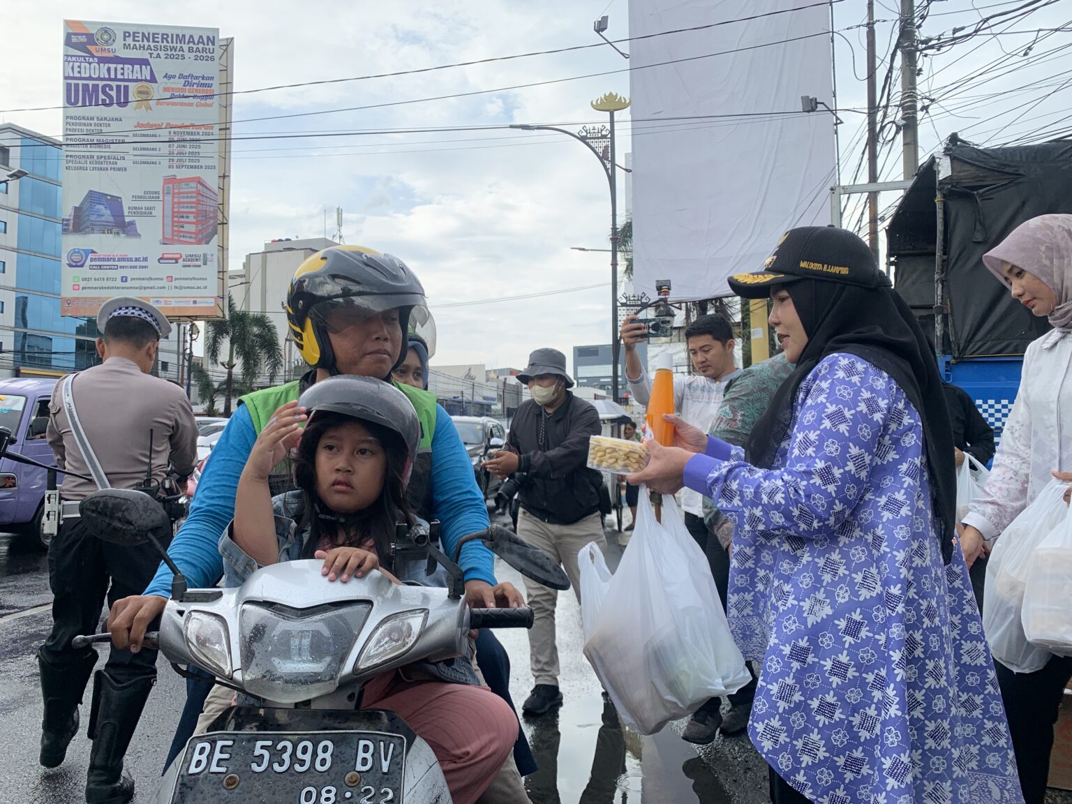 Pembagian takjil ini di lakukan di Bundaran Tugu Adipura dan juga Bundaran Lungsir Bandar Lampung, tepatnya di bawah JPO Siger Milenial pada Minggu (16/3/2025).