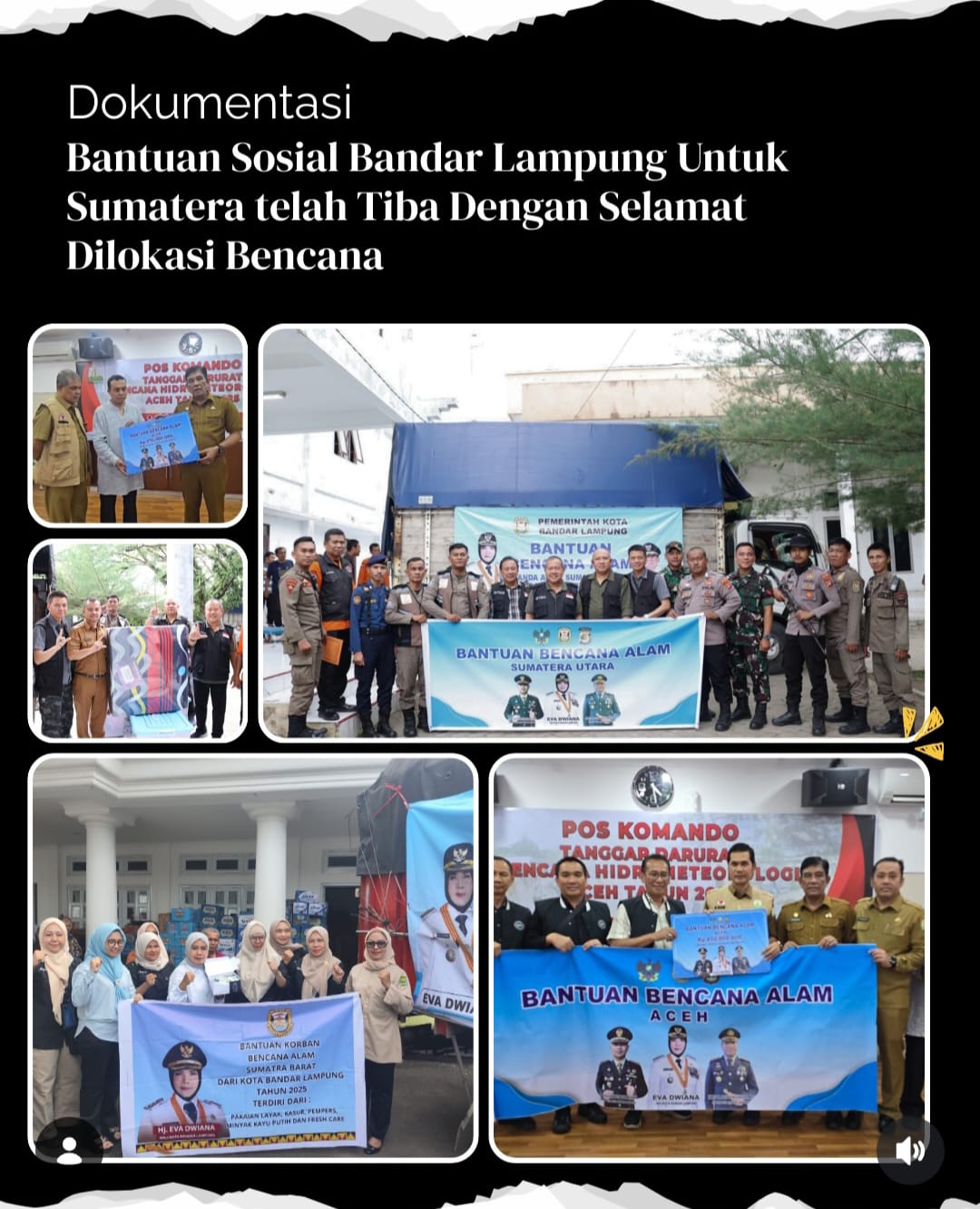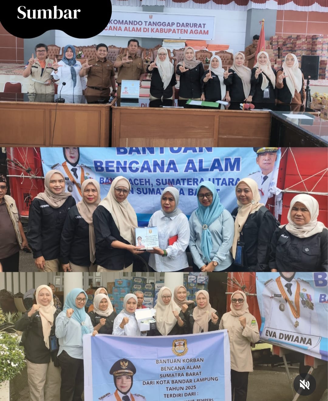 “Alhamdulillah, seluruh bantuan telah disalurkan. Semoga bantuan ini bermanfaat bagi saudara-saudara kita yang terdampak bencana. Terima kasih atas sumbangan dari masyarakat Bandar Lampung dan para ASN di OPD, kecamatan, serta kelurahan,” ujar Wali Kota Bandar Lampung, Eva Dwiana.